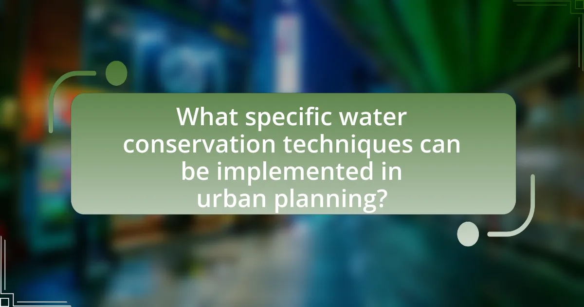 Specific water conservation techniques that can be implemented in urban planning include rainwater harvesting, xeriscaping, and the use of permeable pavements. Rainwater harvesting systems capture and store rainwater for irrigation and non-potable uses, reducing reliance on municipal water supplies. Xeriscaping involves designing landscapes that require minimal irrigation by using drought-resistant plants, which can significantly lower water consumption. Permeable pavements allow rainwater to infiltrate the ground, reducing runoff and promoting groundwater recharge. These techniques are supported by studies indicating that urban areas can reduce water usage by up to 50% through effective implementation of such strategies.